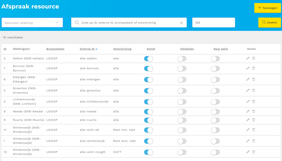In het menu Afspraak resources zijn per locatie de resources gedefinieerd waarvan capaciteit beschikbaar gesteld kan worden.