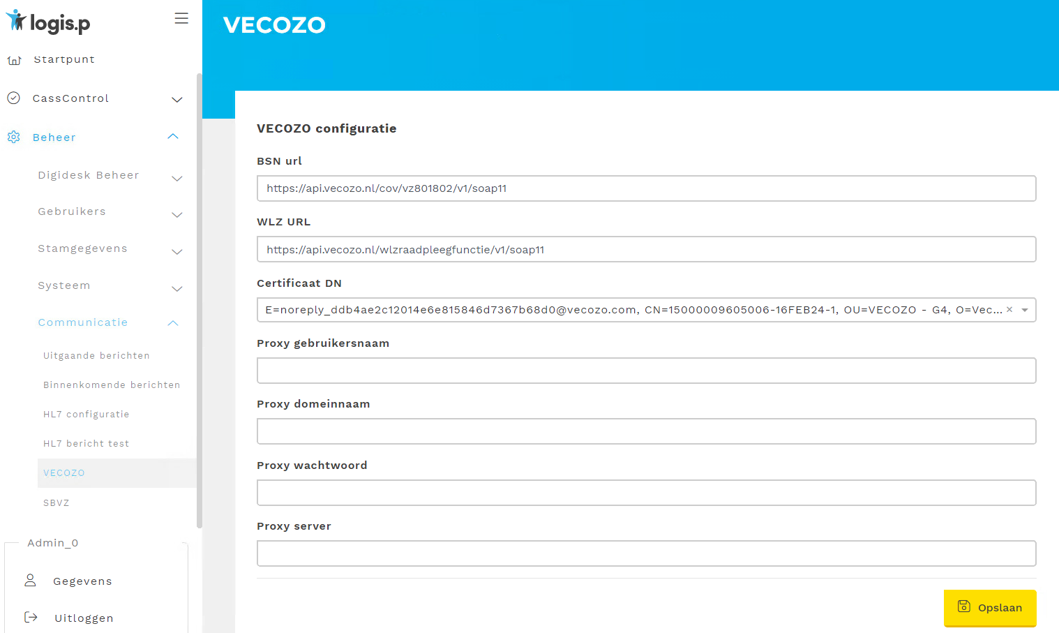 Ga naar de pagina Beheer >Communicatie > Vecozo.