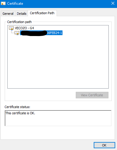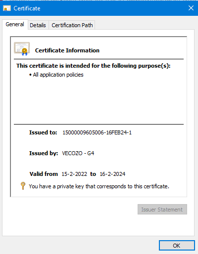 Dubbelklik op het certificaat om te controleren of het goed geïnstalleerd staat. Dit valt aan het volgende te herkennen: